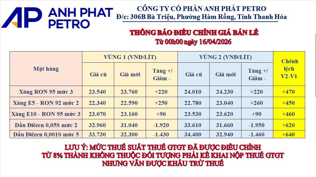 Minh bạch xăng dầu, Tin tức Điều chỉnh giá xăng dầu từ 00 giờ 00 phút ngày 16.04.2026 Kính gửi: Quý khách hàng CÔNG TY CP ANH PHÁT PETRO Trân trọng thông báo: Từ 00h00 ngày 16.04.2026 điều chỉnh giá bán lẻ các mặt hàng xăng dầu (chi tiết theo bảng đính kèm)