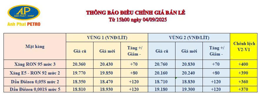 Từ 15h00 ngày 04/09/2025 điều chỉnh giá bán lẻ các mặt hàng xăng dầu (chi tiết theo bảng đính kèm)