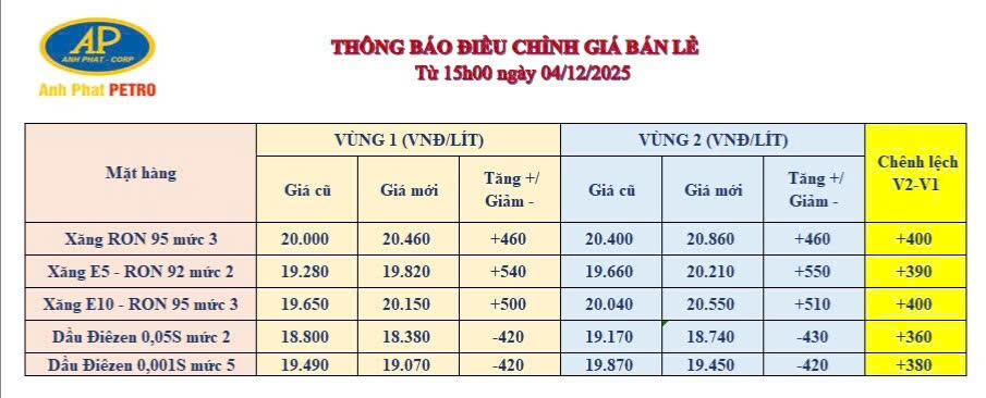 Điều chỉnh giá xăng dầu từ 15 giờ 00 phút ngày 04.12.2025