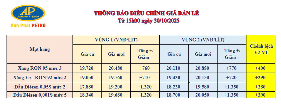 Minh bạch xăng dầu, Tin tức Điều chỉnh giá xăng dầu từ 15 giờ 00 phút ngày 30.10.2025 Kính gửi: Quý khách hàng CÔNG TY CP ANH PHÁT PETRO Trân trọng thông báo: Từ 15h00 ngày 30/10/2025 điều chỉnh giá bán lẻ các mặt hàng xăng dầu (chi tiết theo bảng đính kèm)