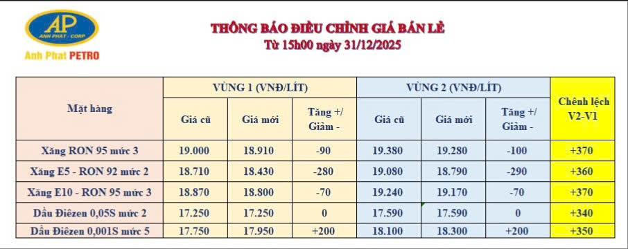 Từ 15h00 ngày 31/12/2025 điều chỉnh giá bán lẻ các mặt hàng xăng dầu (chi tiết theo bảng đính kèm)